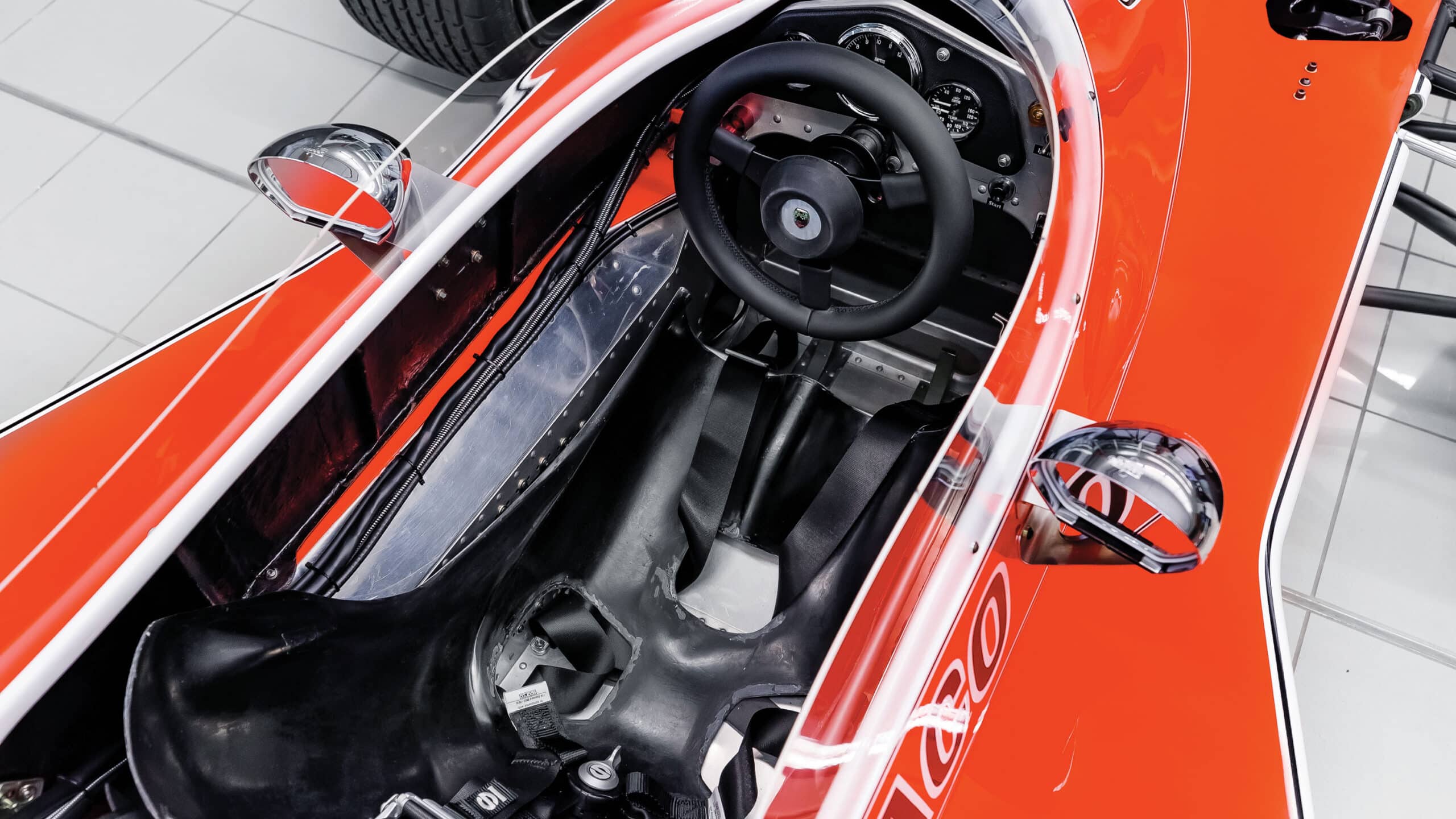 Rapidly, the car began to come together. A new Cosworth DFV was supplied from a well-known UK specialist to correct ‘wide pump’ specification, while Heritage systems engineer Julian Coates unravelled the mysteries of the ‘spark box’ and built up a wiring loom. The wheels are original items, carefully crack tested, and while the evocative rear-view mirrors were bought in, the brackets were water-jet cut out of a flat sheet of aluminium, and then folded into shape by the F1 team’s fabricators. Ryan knows his way around an M23 – he rebuilt chassis 5 earlier in the year – and is confident it would be difficult for the mechanics in period to tell the difference between this car and one of the team’s actual race chassis. Sometimes that attention to detail has made the job harder: the plumbing, for example, has been done with period olive-type connections and fittings instead of the modern swaged fittings used today. Having said that, the central part of the steering wheel has been 3D printed – perhaps the one modern part on the car.