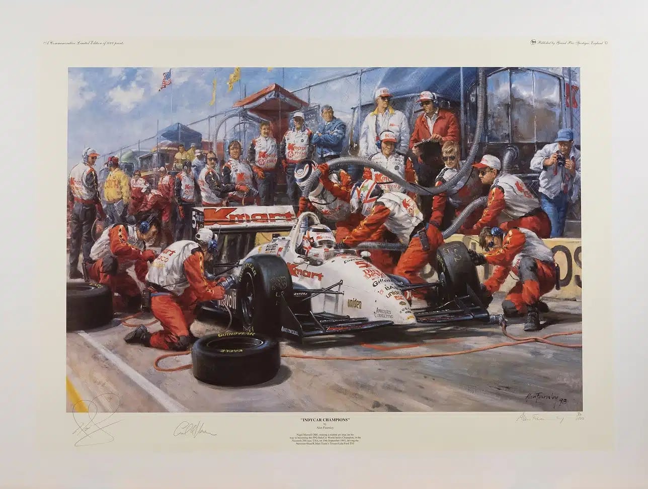 Nigel Mansell OBE, making a routine pit stop on his way to becoming the PPG IndyCar World Series Champion, in the Nazareth 200 race, USA, on 19th September 1993, driving the Newman-Haas/K.Mart Team’s Texaco Lola Ford T93. Signed by Nigel Mansell, Carl Haas, Paul Newman & Alan Fearnley. A great purchase for fans of Indycar memorabilia and American motor sport collectibles.