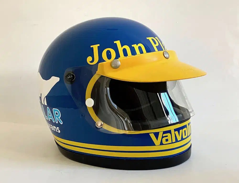 This Ronnie Peterson full size display helmet is a perfect Formula 1 replica helmet, modelled after the helmet that “Super Swede” Peterson wore during his Formula 1 career. A two-time World Championship runner up, this is the perfect helmet for fans of Ronnie Peterson Memorabilia and Ronnie Peterson collectibles.